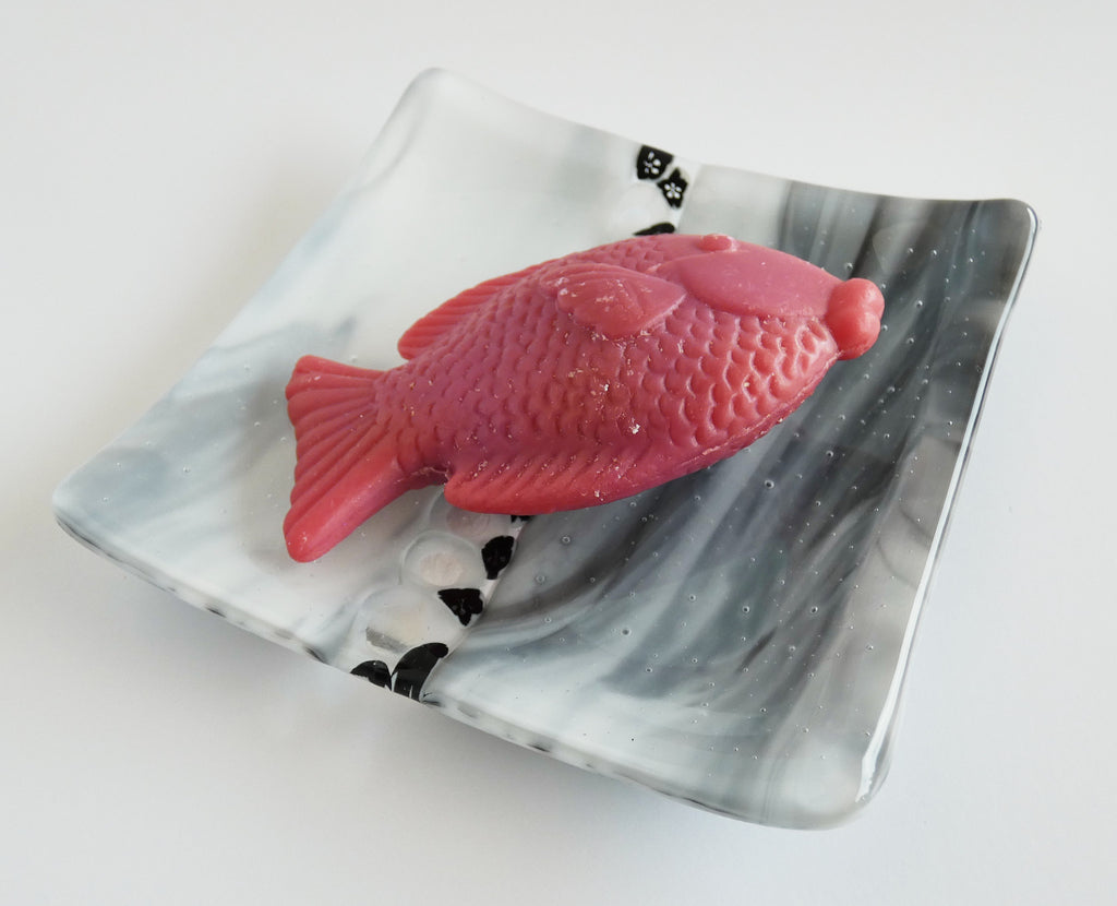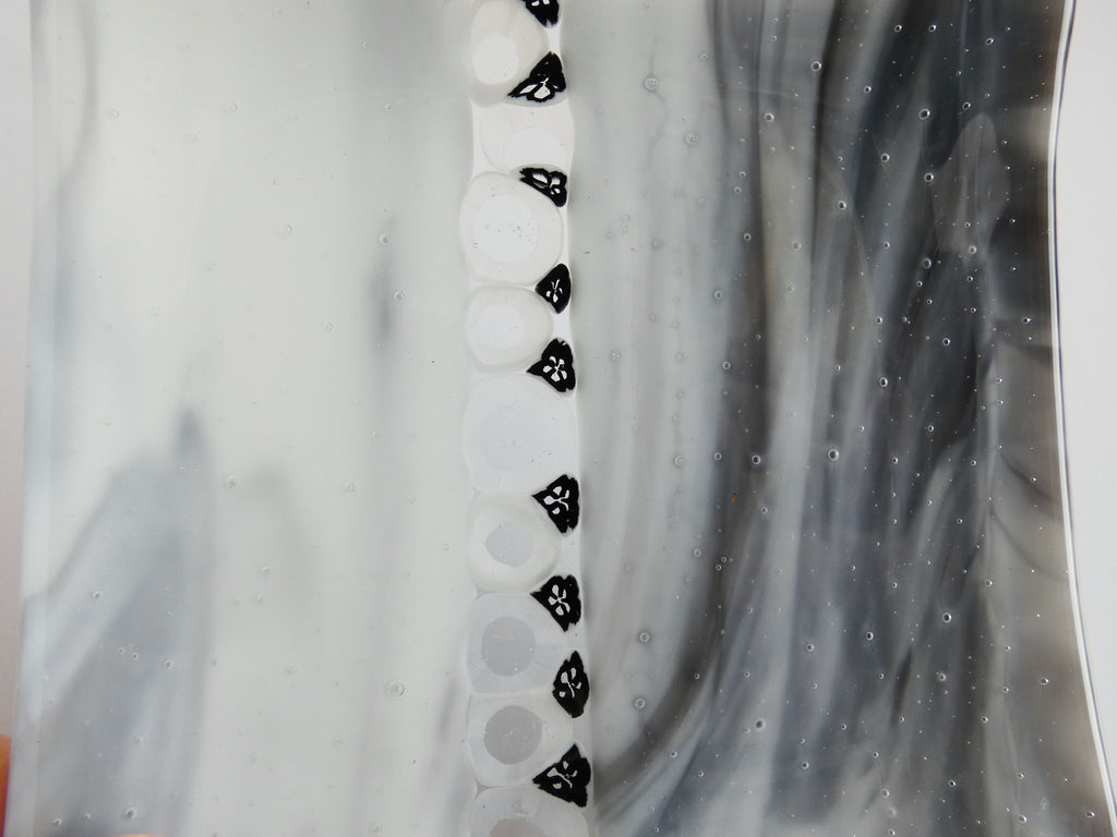 Check out this sweet little fused glass plate in streaky black and white glass with a stripe of fun black and white murrini. Plate measures about 4" square. It would look great by the sink, on the window sill or by your bed -- a handy little spot for your precious items, a small soap, large tea light or even a tea bag and spoon.