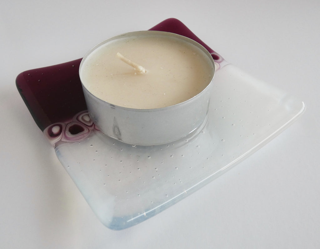 Check out this sweet little glass plate in streaky white and fuchsia transparent glass with a stripe of fun fuchsia and white glass murrini. Plate measures about 4" square. It would look great by the sink, on the window sill or by your bed -- a handy little spot for your precious items, a small soap, large tea light or even a tea bag and spoon.