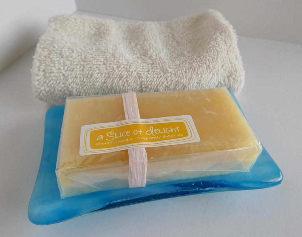 Contemporary style fused glass soap dish in streaky turquoise blue and white glass. Perfect for your bars of beautiful soap, this dish has 3 raised bars down the center to keep your soap dry. This soap dish measures approximately 3" by 5" (7.6 cm by 12.7 cm).