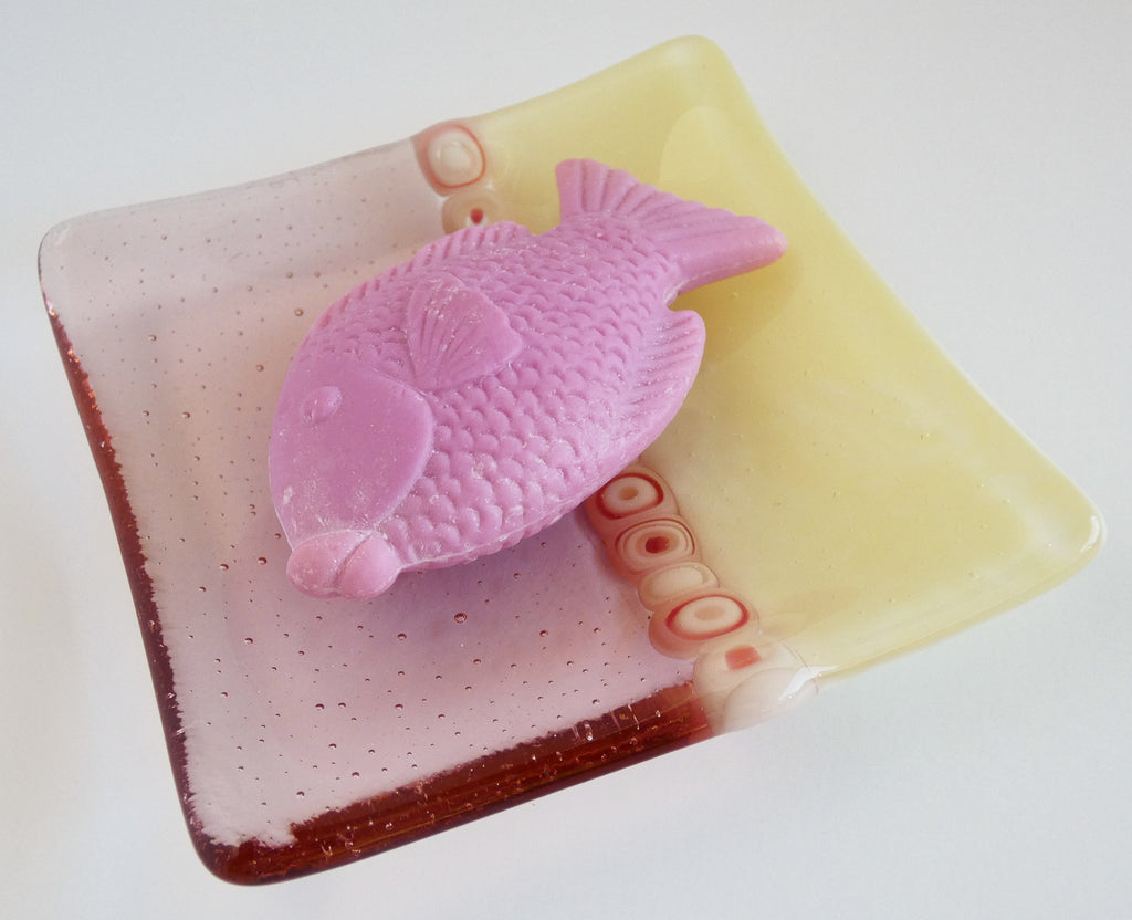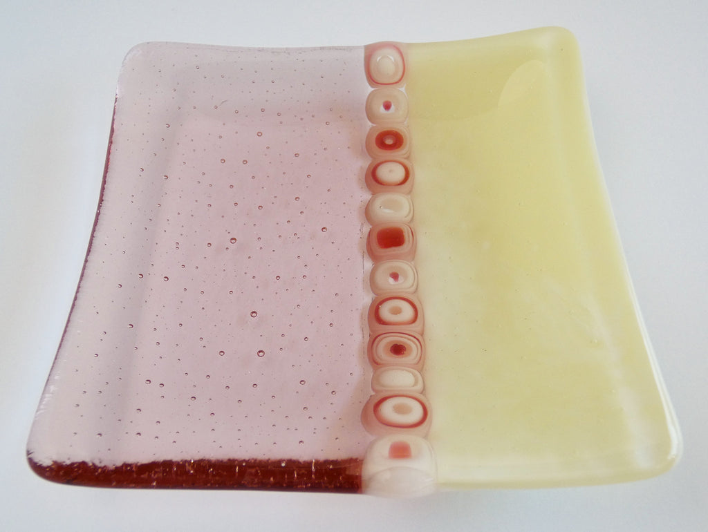 Check out this sweet little glass plate in pale coral transparent and opaque cream glass with a stripe of fun light coral and cream glass murrini. Plate measures about 4" square. It would look great by the sink, on the window sill or by your bed -- a handy little spot for your precious items, a small soap, large tea light or even a tea bag and spoon.